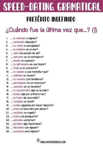 Speed Dating en clase de ELE . 11 febrero, 2019 . 14 febrero, 2018 por mling . El amor se ha adueñado de los materiales de Linguactually en pleno mes de febrero, el día de San Valentín, ¡no lo hemos podido evitar! Nos hemos preguntado, ¿por qué no organizar un Speed Dating o citas rápidas en la clase de español para practicar un poco la . . .