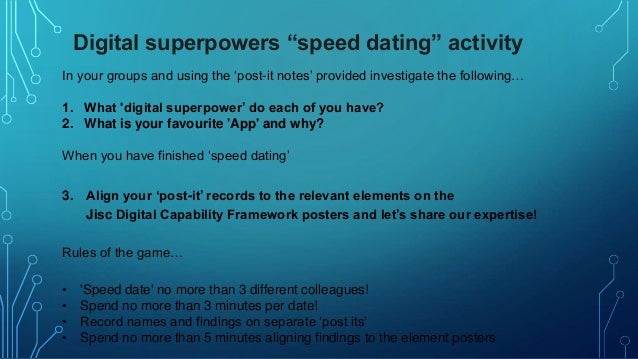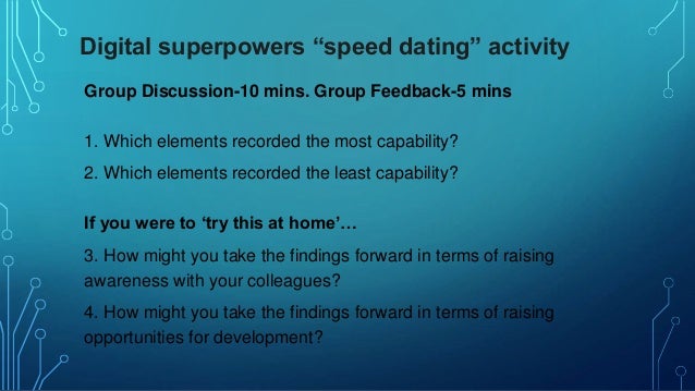 Speed dating is all about exchanging ideas with as many different people as possible in a short time . This makes it perfect if you're preparing a longer meeting for a team that only sees each other occasionally or is perhaps meeting for the first time . Speed dating . Divide the participants into groups .