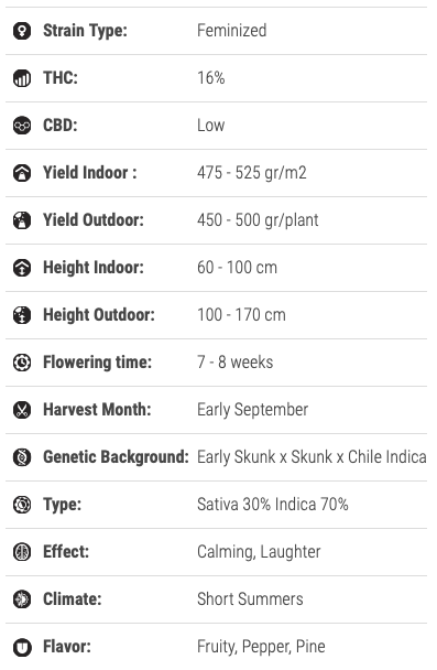Speedy Chile - це гібрид Early Skunk x Skunk та Chile Indica, який має чудовий смак та розслаблюючий ефект. Early Skunk - елітний клон, який заслужив репутацію виробника квітів медичної марихуани найвищої якості. Потужний Early Skunk ідеально підходить для зняття болю, проблем зі сном і є природним підсилювачем апетиту. Гібрид Speedy Chile на 30% складається з сатіва і на 70% з індики, тому ви можете очікувати, що рослини будуть трохи витягуватися і добре заповнюватися під час цвітіння. Ця суміш також забезпечує високу якість. Вплив сатіви можна відчути, як повільно підкрадається до вас, а Speedy Chile забезпечує високий ефект, який ідеально підходить для тих, хто має завдання, які потрібно виконати протягом дня.