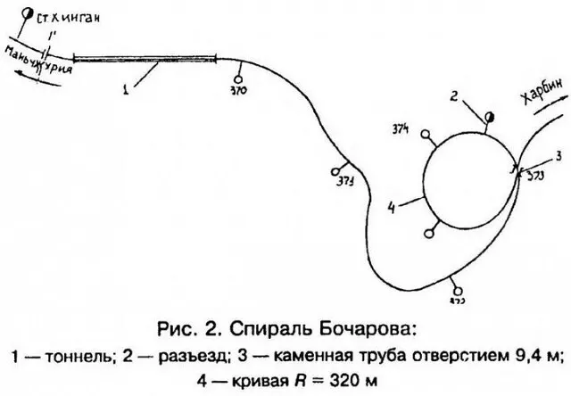 Комплексное решение задачи было поручено инженеру Николаю Николаевичу Бочарову. Легкий наклон тоннеля в восточную сторону, в сторону Харбина, не решал основной проблемы: как после выхода из тоннеля спуститься вниз, в долину, ведь тоннель был заложен на высоте 970 метров. По-другому не получалось. Если только не проложить огромный обходной маршрут в 18 км. Но это дорого. Бочаров принял решение осуществить спуск не по прямой (невозможный), а по выходе из тоннеля вправо, вдоль горной гряды, выравнивая и укрепляя трассу выбранным здесь же скальным грунтом. Пришлось разработать вручную и взрывчаткой более 400 тысяч кубических метров того грунта (подсчитал: примерно 110 ж/д составов по 60 вагонов!). В итоге получилась выровненная выемка глубиной до 20 метров. Иногда это называют «полка». А в котловине построить мосты через речку. Затем построить спираль, которая должна была пройти под началом витка. Впрочем, посмотрите на схему, так понятнее.