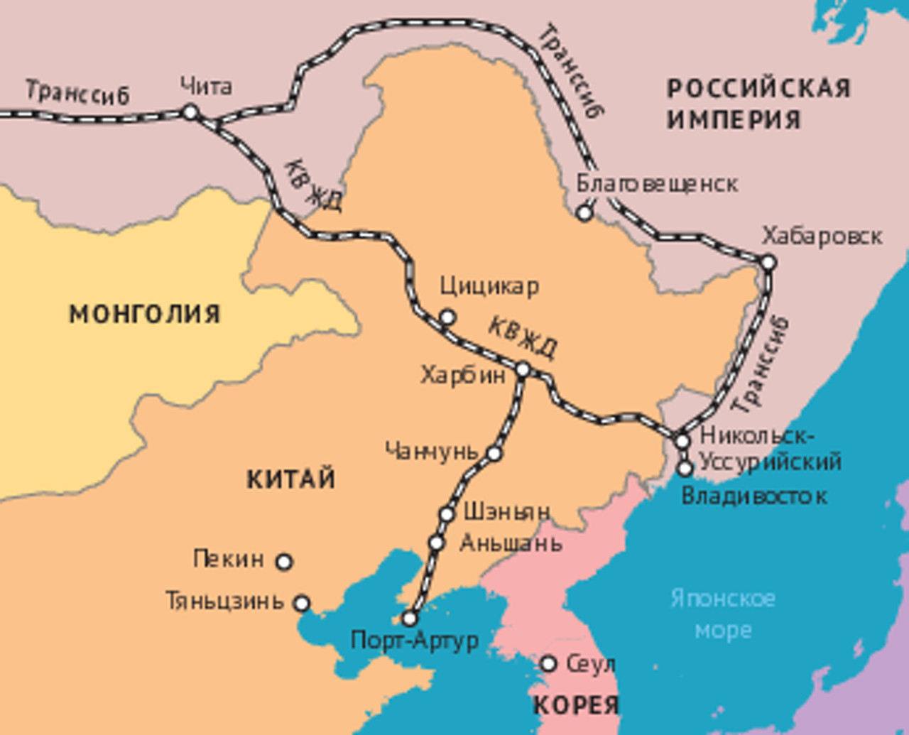 Вскоре покатили составы, пассажирские и грузовые. Скорый добирался до Порт-Артура от Москвы за 13 суток и 4 часа. А из порта Дальний, арендованного Россией вместе с Ляодунским полуостровом, пароходами-экспрессами можно было продолжить путь до Шанхая и Нагасаки. Россия вышла к Тихому океану во Владивостоке и Дальнем.