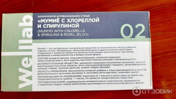 Состав Веллаб Мумиё - Спирулина : мумиё алтайское, спирулина (порошок), хлорелла (порошок), чага (сухой экстракт), бета-каротин, маточное молочко, витамин А (ретинола ацетат) .