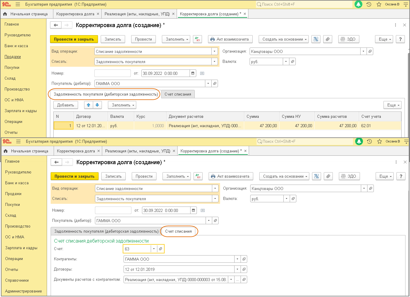 Списать долги в 1с 8.3