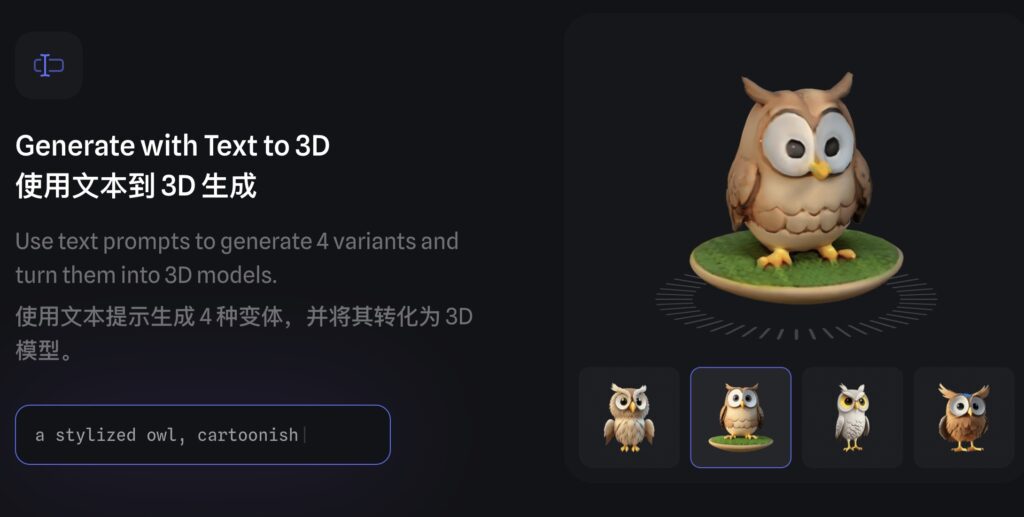 • 使用文本提示生成3D模型,例如输入“一辆蓝色汽车”或“一个卡通风格的猫头鹰”,系统会根据这些提示创建相应的3D对象。