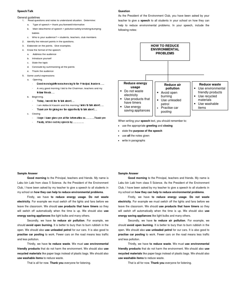 SPM Sample Essay - Speech (How to Improve the Students' Standard of English) November 2, 2015 / CoNNaR Kaki . QUESTION 1 : . . . This talk is also an appropriate introduction to our English Language Week which begins today . All of you know the importance of English . It is the language of knowledge, international communication and trade .