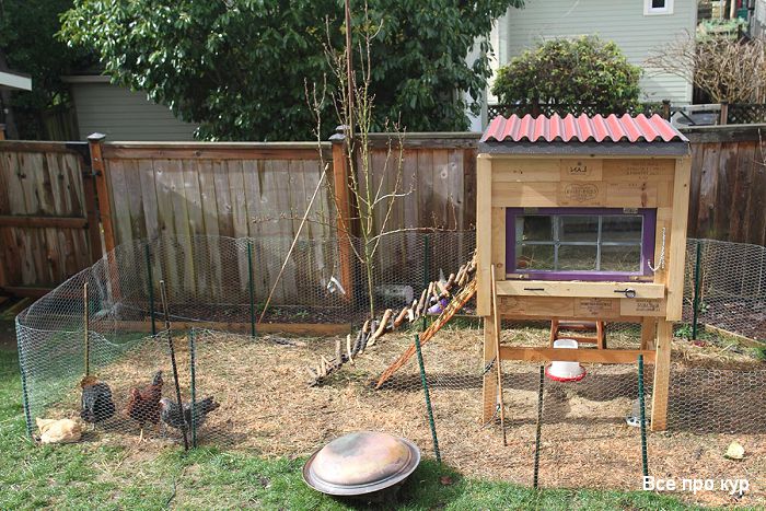 Конструкция просто ставится на траву, и цыплята весь день поедают траву, ловят насекомых и личинок, могут склевать и червяка, если найдут . В результате им не нужна подстилка, а проблема корма решается просто: на следующий день клетку просто перемещают на соседний участок . . .