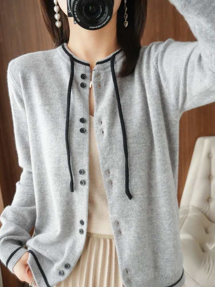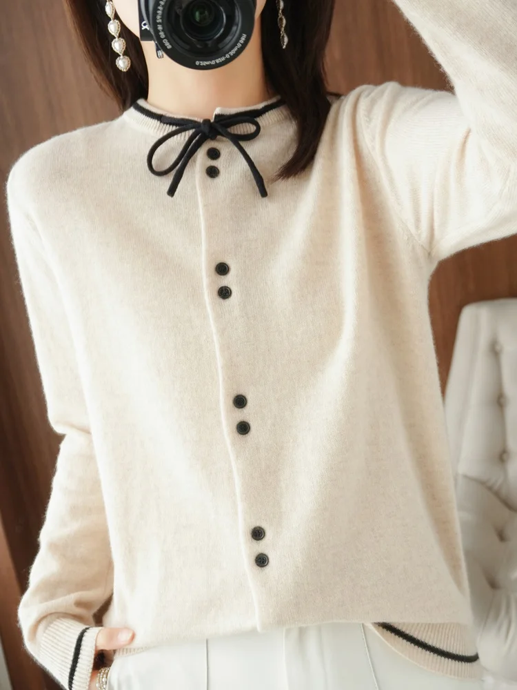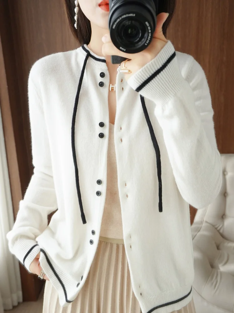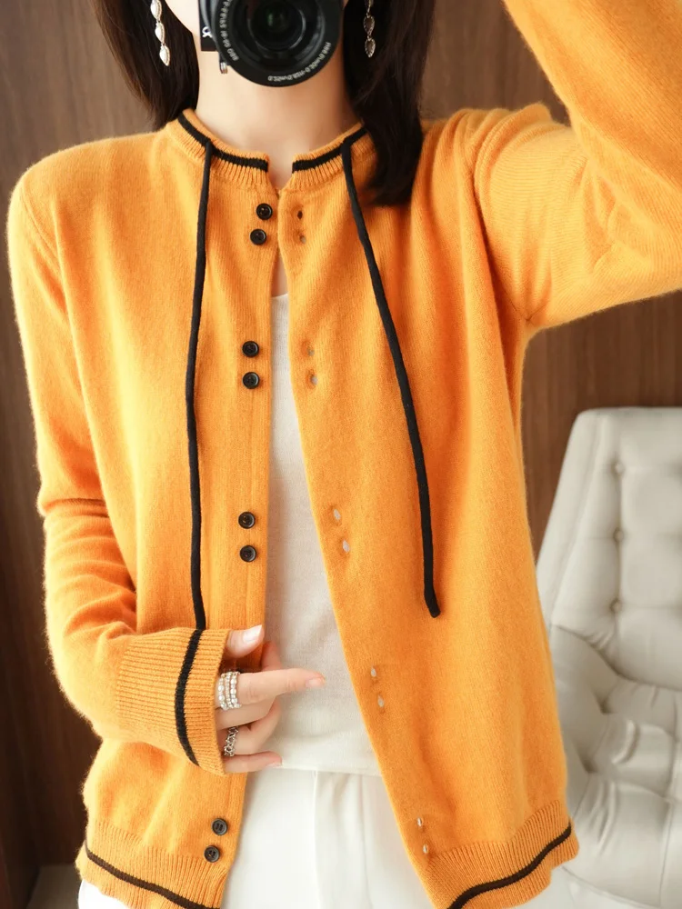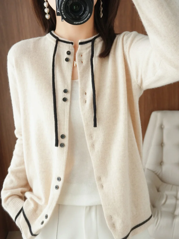2022 Autumn And Winter New 100 Pure Wool Knitted Cardigan Womens Round Neck Color Block Outer Wear Knitted Bottoming Shirt po lu 10 09