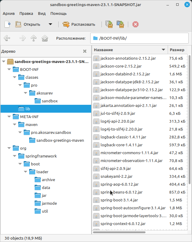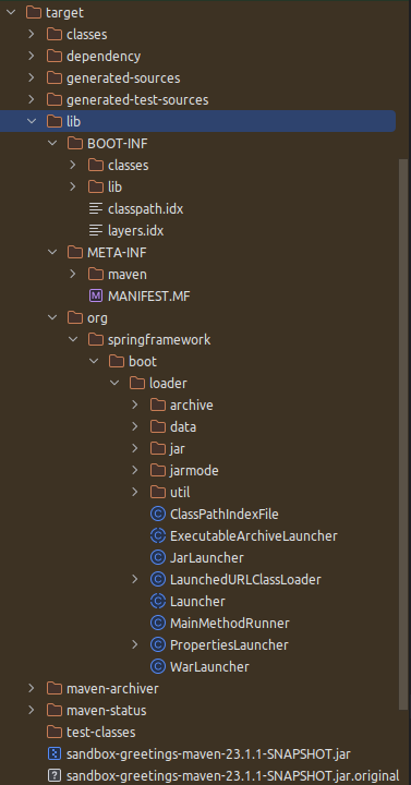 application- файлы нашего проектаdependencies- runtime-зависимости проектаsnapshot-dependencies- SNAPSHOT-зависимости проектаspring-boot-loader- файлы загрузчика Spring Boot