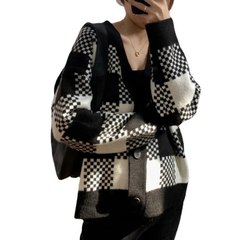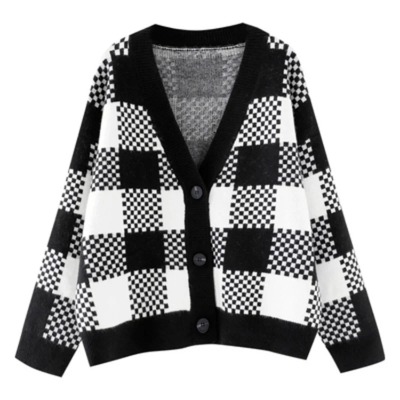 XiDzJtnaqmДолго искали Spring New Loose OuterWear Lazy Style Top Sueter Mujer Invierno 2022 Black and White Plaid Knitted Sweater Cardigan Coat Women, но не могли найти? Предоставляем вашему вниманию Spring New Loose OuterWear Lazy Style Top Sueter Mujer Invierno 2022 Black and White Plaid Knitted Sweater Cardigan Coat Women по лучшей цене на рынке!