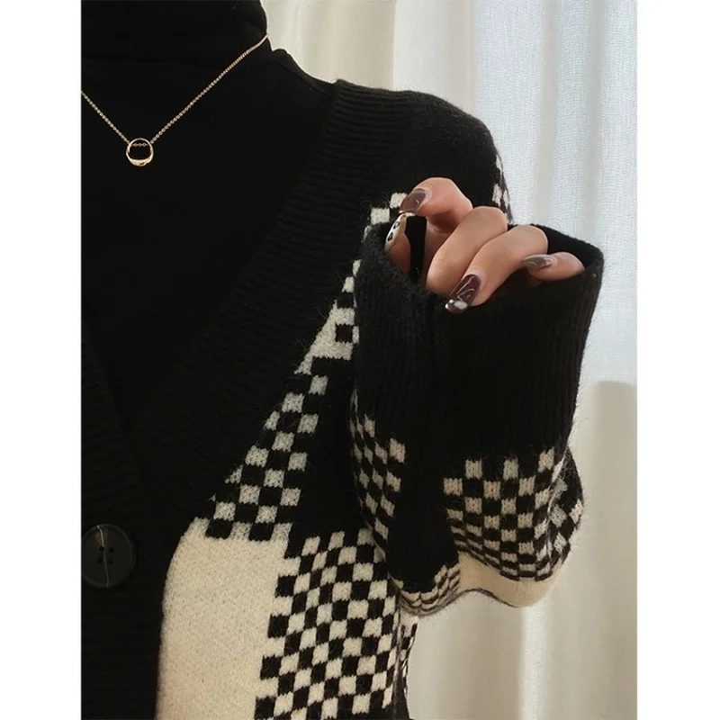 «Spring New Loose OuterWear Lazy Style Top Sueter Mujer Invierno 2022 Black and White Plaid Knitted Sweater Cardigan Coat Women» по лучшей цене на рынке! Всего за 23$ (2185рублей)