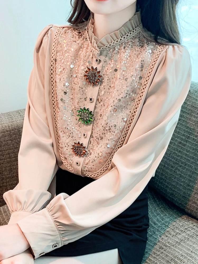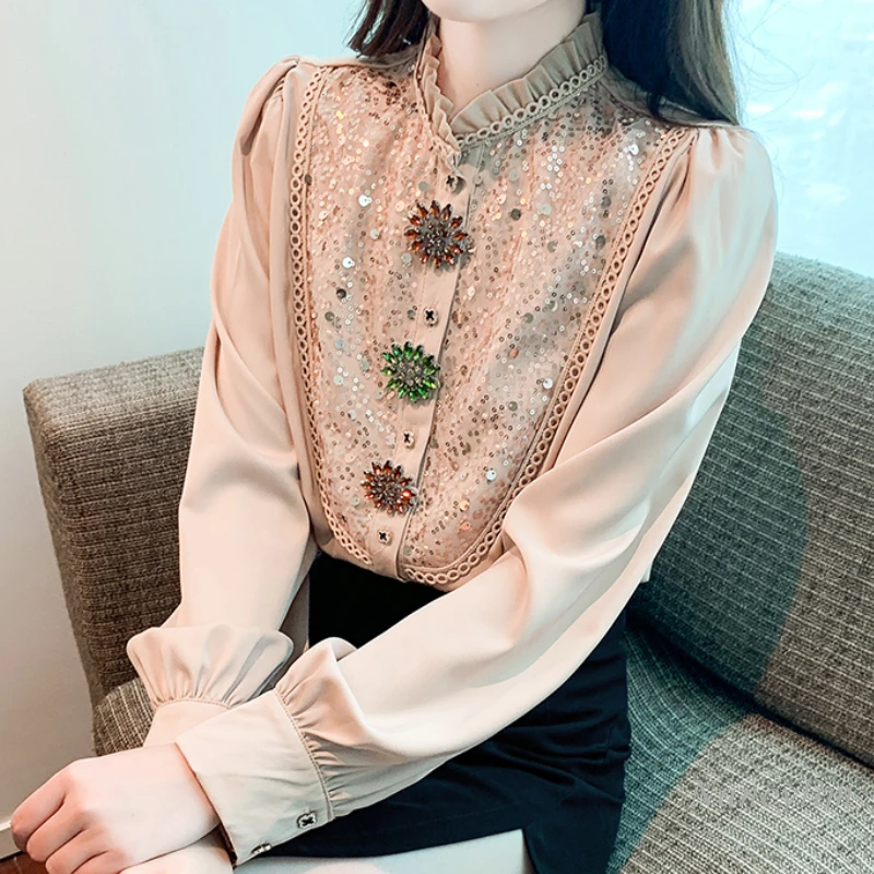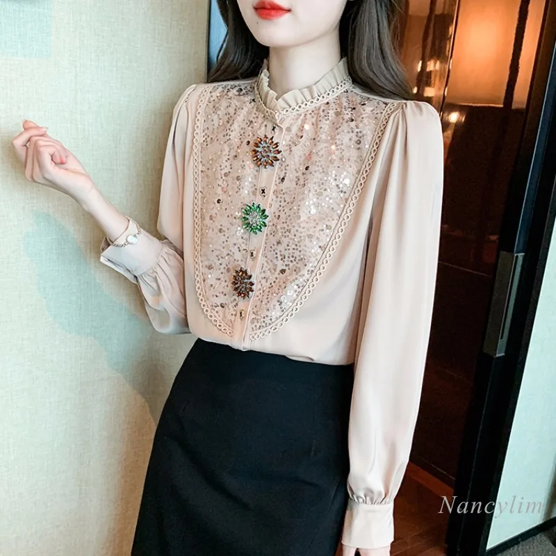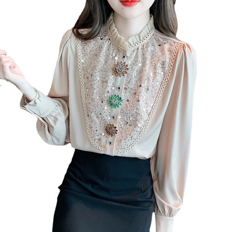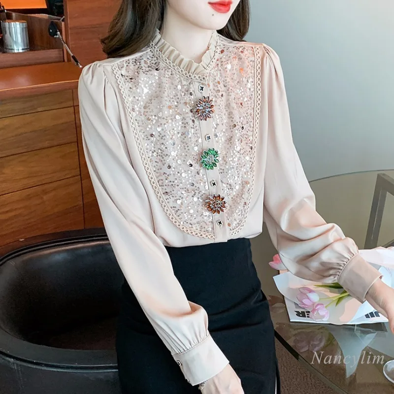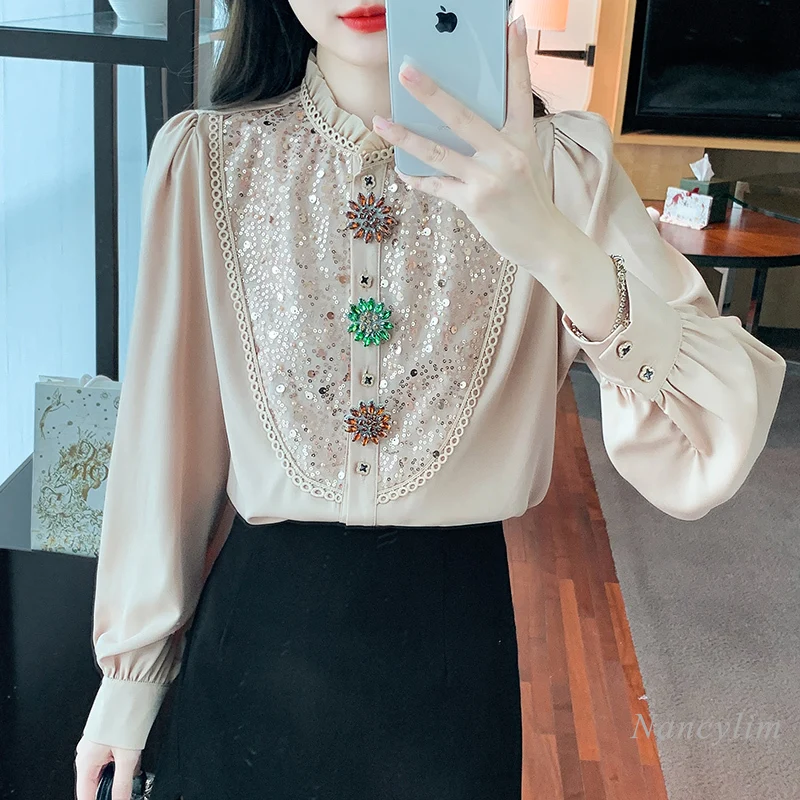 Spring and Autumn Long-Sleeved Shirt Women's 2023 New High-End Top Design Sense Beautiful Rhinestone Buttons Sequins Blouses - Купить с бесплатной доставкой