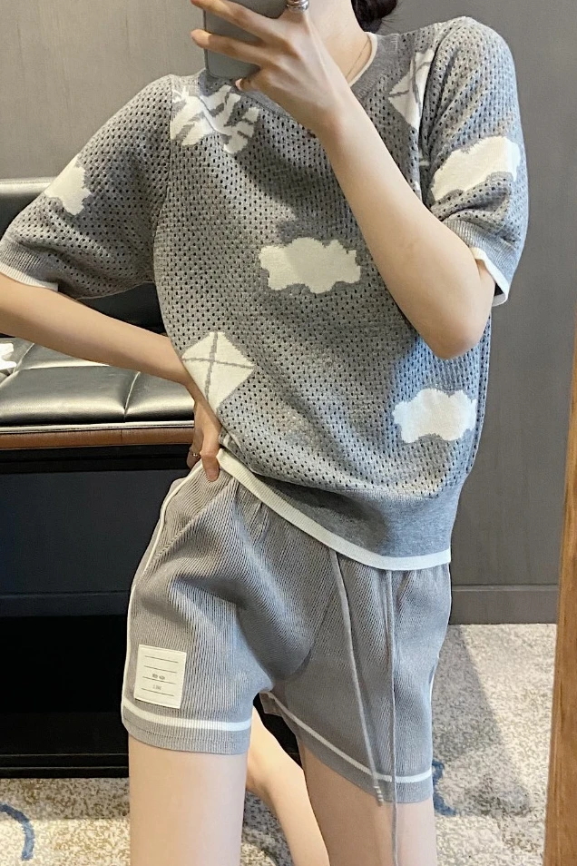 "Spring and summer new cloud plane pattern short-sleeved female TB hollow knitted age-reducing t-shirt light wool high version" * Buy Now Just For 36$