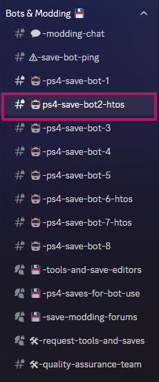 Now that you got the role, you can see a list of chat bots. We need a bot with the name “ps4-save-bot2-htos”.