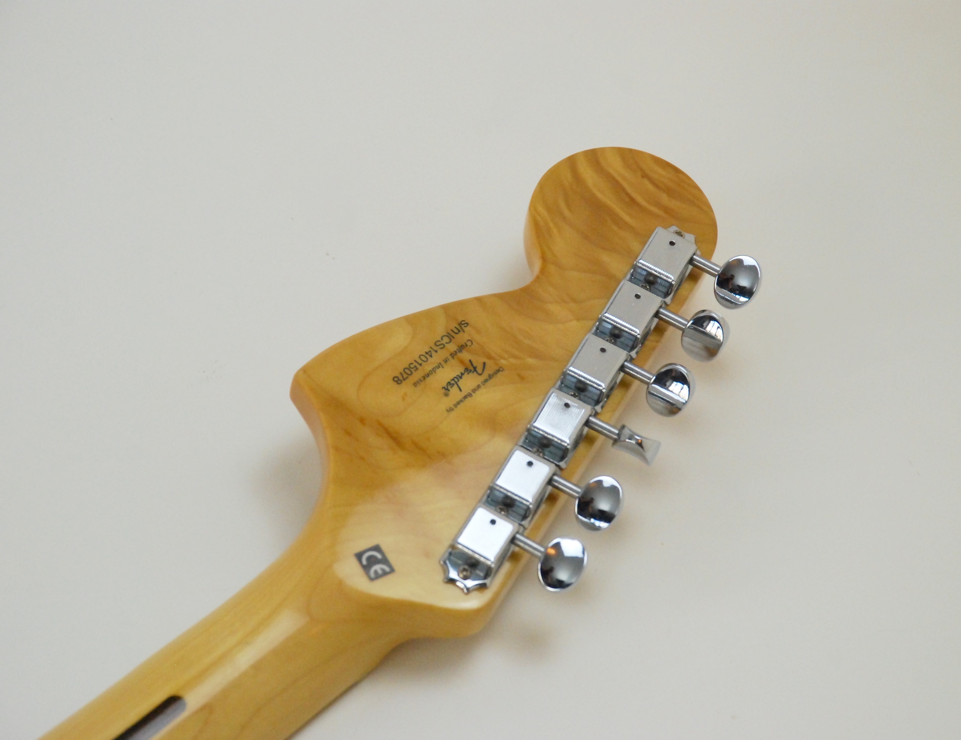 The neck is similar to the Classic Vibe profile, but I wonder if it feels just a tiny bit fatter. I have stripped the original lacquer off the Classic Vibe and it was very thick, so maybe that is the difference I am sensing! The maple fingerboard is great (I prefer maple to rosewood for feel). It’s nimble, smooth to play and the whole guitar feels like it’s working with me rather than against me. The best style tuning pegs ever invented (in my opinion) make this a breeze to change strings and holds tuning properly. The nut seems to be cut to perfection and there is no binding on any of the strings.