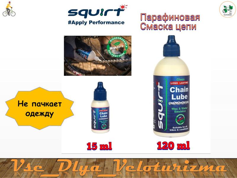 Смазка для цепи Squirt на основе парафина . В состав Squirt Chain Lube входят различные парафины и чистая вода в виде специально разработанной эмульсии, которая хорошо удердерживается на цепи и не . . .