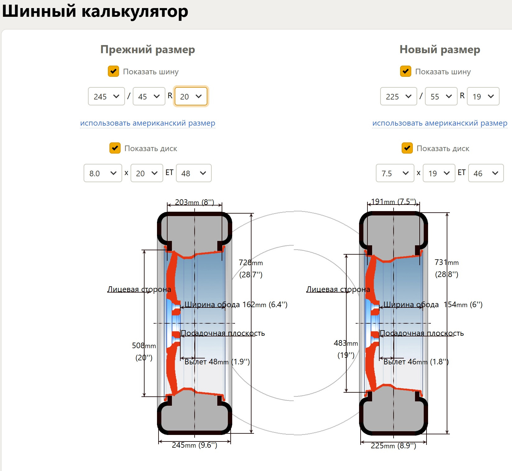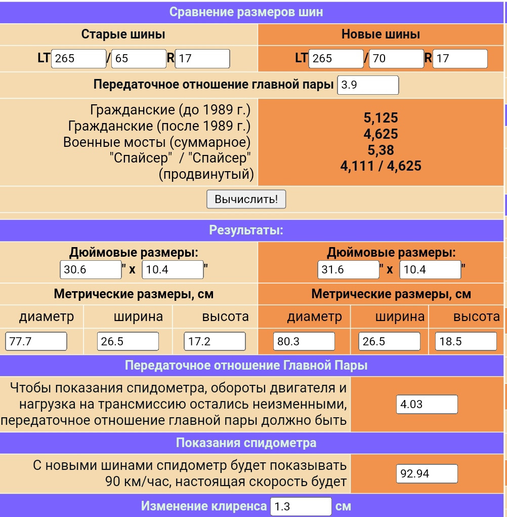Сравнить колеса калькулятор