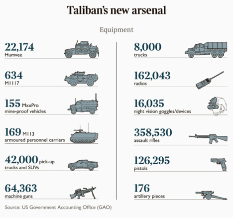 Последствия потери этой мудрости видны на картинке ниже. Двадцать лет войны США в Афганистане привели лишь к тому, что противник Западной коалиции – Талибан [запрещенная в России организация] получил вооружений на сумму 81 миллиард долларов и стал одной из самых технически оснащенных армий мира. И если несмотря на соблазны культуры экрана и терапевтической воли, Западный истеблишмент не вернет хотя бы в рамках институтов принятия решений мышление на его законное место и роль, то эта катастрофа-фарс будет не последней.