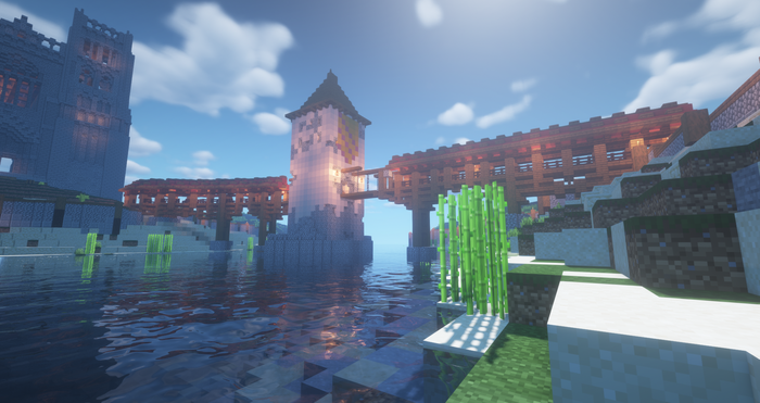 Большой и очень красивый спавн для сервера Minecraft в виде замка, вокруг которого ров, от замка идут четыре моста . Спавн большого размера, средневековый стиль, очень яркий и интересный .
