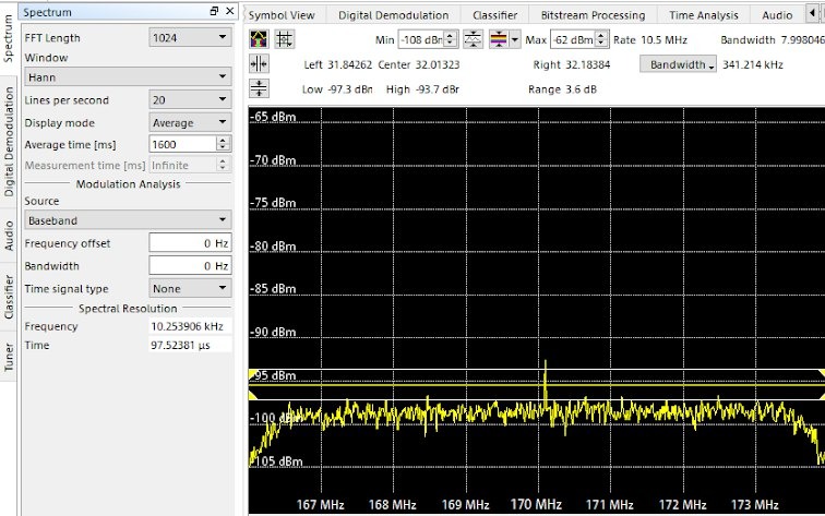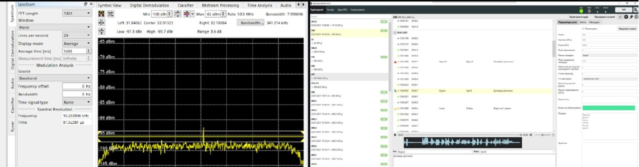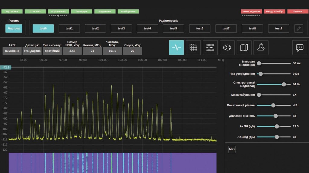 Так выглядит часть специального программного обеспечения предназначенная для поиска сигналов в рабочем диапазоне и анализа обстановки в радиоэфире в режиме реального времени. Оператор имеет возможность осуществлять контроль эфира во всей полосе мгновенного обзора - 20 МГц - без дополнительных переключений или настроек.
