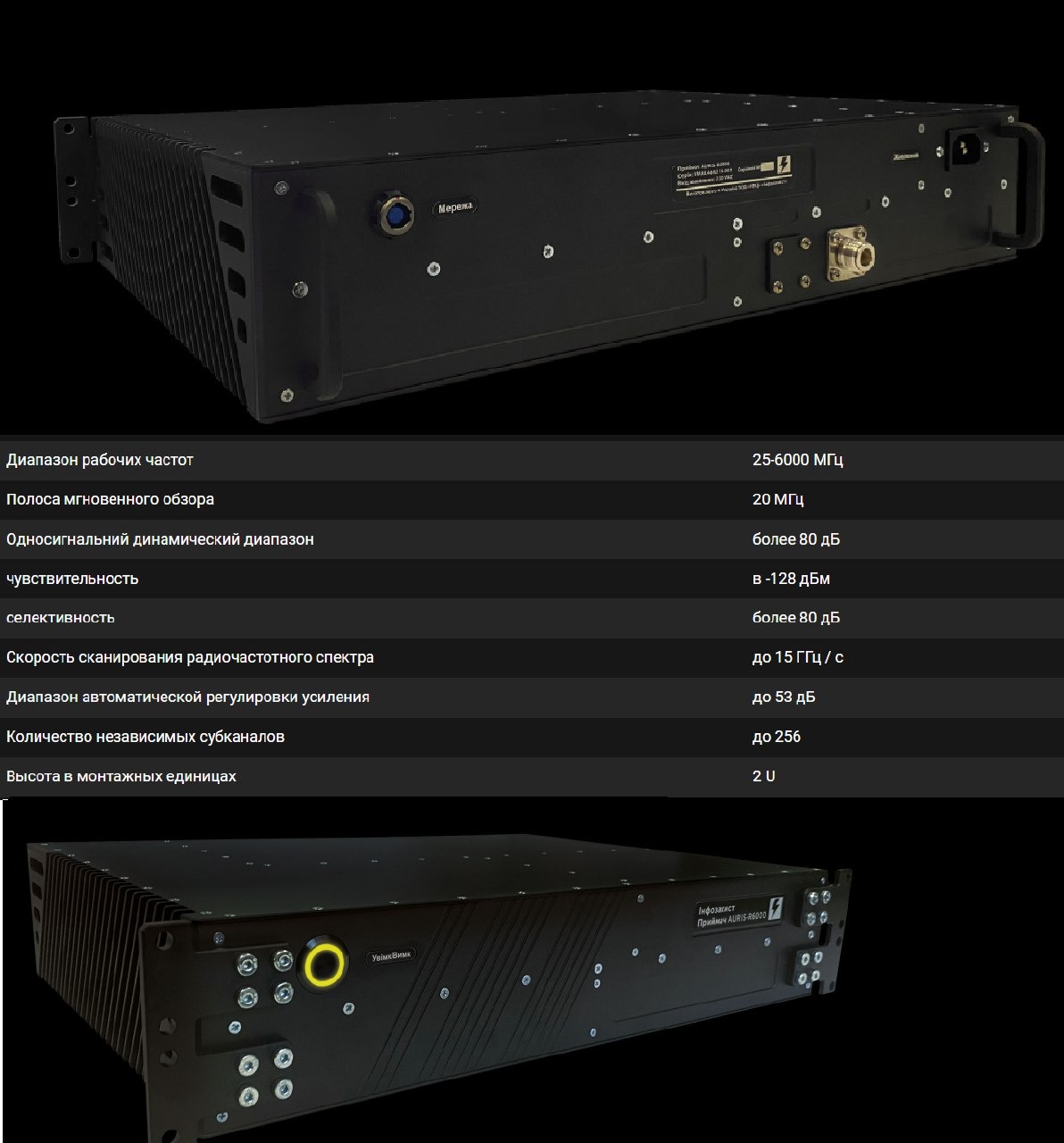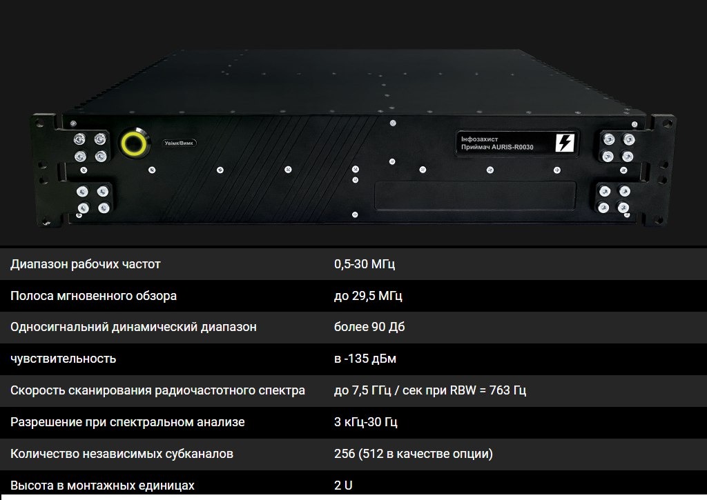 Предназначен для радиомониторинга и радиоразведки,способен принимать и обрабатывать сигналы в диапазоне 25-6000 МГц. Компанией «Инфозахист» разработана не только аппаратная часть SDR-приемника AURIS-R6000, но и специализированное программное обеспечение, в том числе в части демодуляции сигналов. Технические характеристики устройства качественно отличают его как на украинском, так и на международном рынке военных радиоприемников.