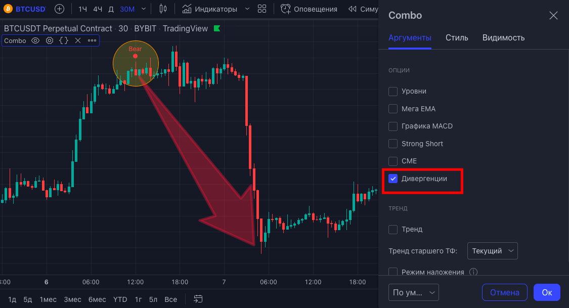 При активации данной опции, можно на графике наблюдать наличие бычьих и медвежьих дивергенций.
