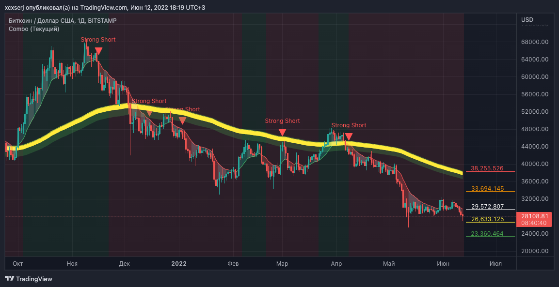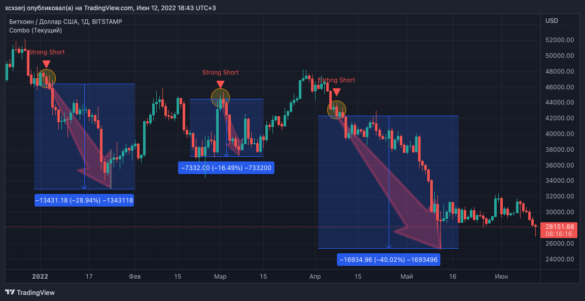 Опция "Strong Short" показывает сигналы, которые вычисляются по авторской методике по данным, которые берутся из блокчейна. При появлении данного сигнала с высокой вероятностью можно ожидать обвал цен. (Для 1д ТФ, ВТС)