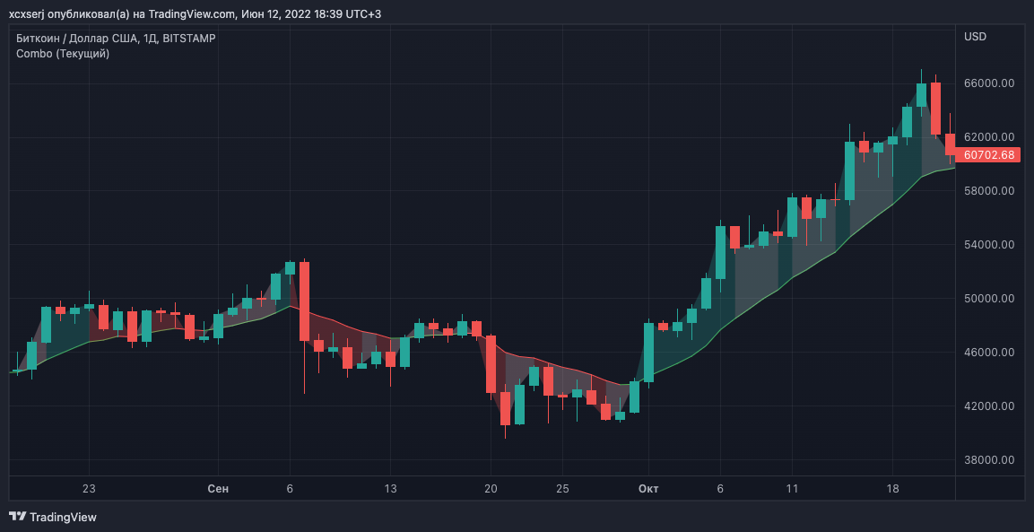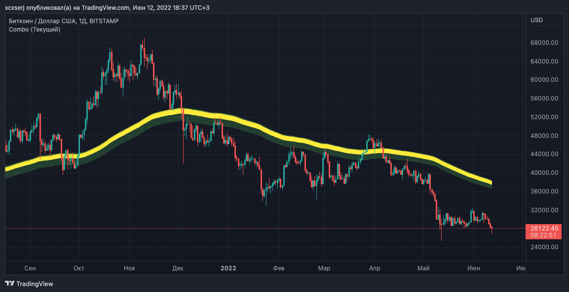 Опция "Мега EMA" так же показывает хорошее взаимодействие с ценой и может служить ориентиром для определения бычьего/медвежьего цикла, а так же использоваться в качестве динамического уровня поддержки/сопротивления. (Для 1д ТФ, ВТС)