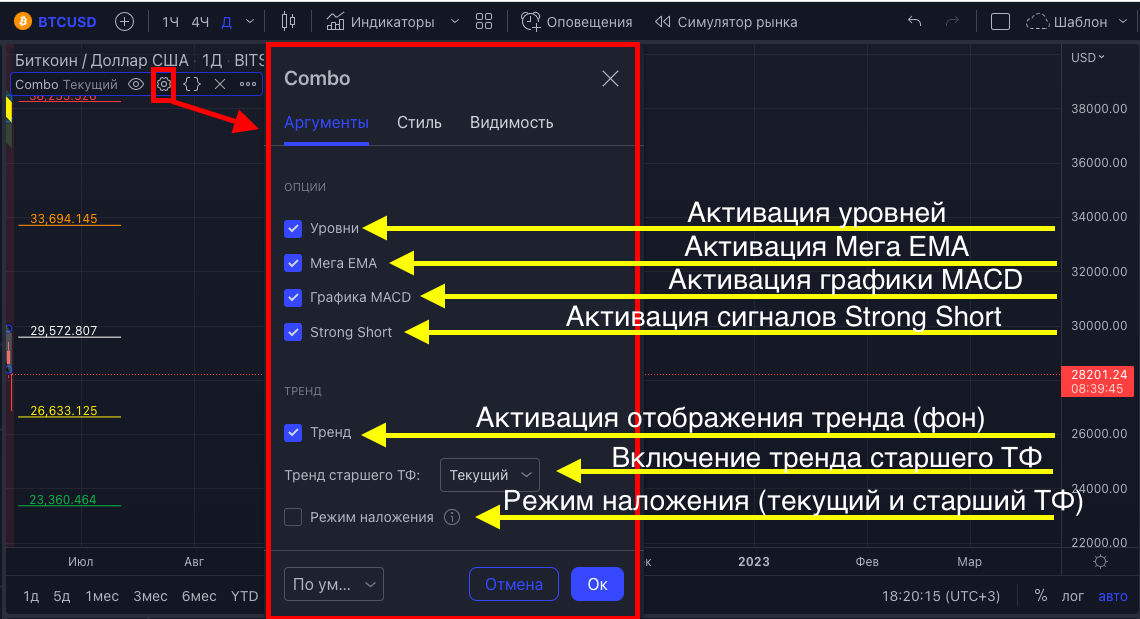 Теперь можно, просматривая график низких ТФ, активировать Комбо-уровни со старших ТФ, чтобы быстрее можно было ловить сигналы, не дожидаясь окончания формирования свечи старшего ТФ и визуально ориентироваться на более глобальные движения цен.