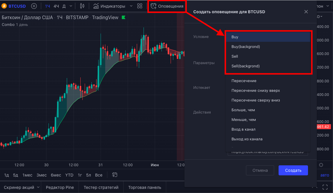 Есть возможность создать оповещения по смене тренда при включенной опции "Тренд", где Buy/Sell - это смена тренда на бычий/медвежий тренд, а Buy(background)/Sell(background) - это оповещение о том, какой на данный момент тренд.