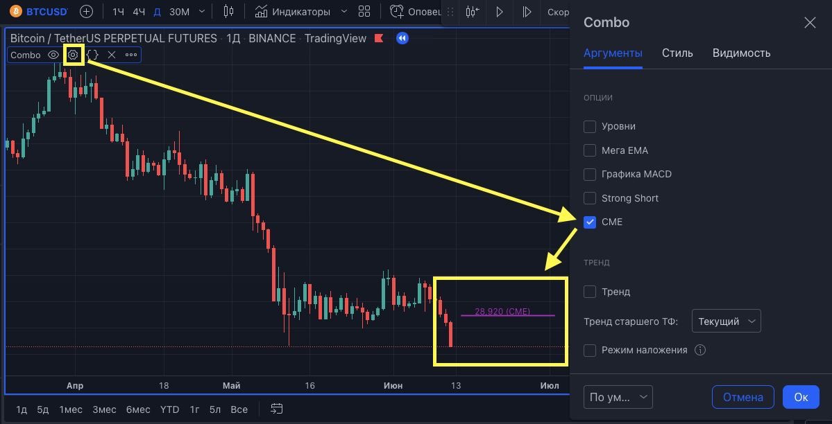 Добавилась новая опция - «CME». Данная опция отображает цены фьючерсов BTC на Чикагской товарной бирже CME
