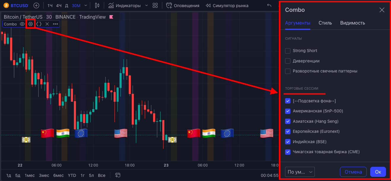Можно выбрать интересующую вас сессию и включить ее отображение. При активации - на графике появится подсветка и флаг, который покажет время открытия нужной вам торговой сессии.