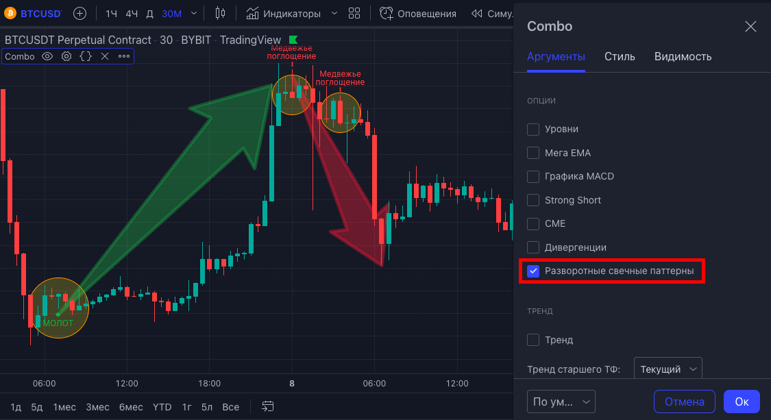 При активации данной опции, можно на графике наблюдать разворотные свечные модели в зонах перекупленности/перепроданности