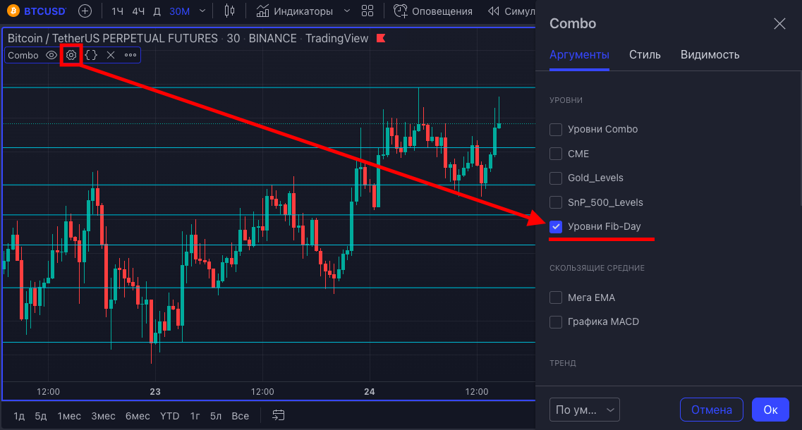 При активации данной опции, на вашем графике появятся уровни Фибоначчи, основанные на Хай и Лоу предыдущего и текущего дня.