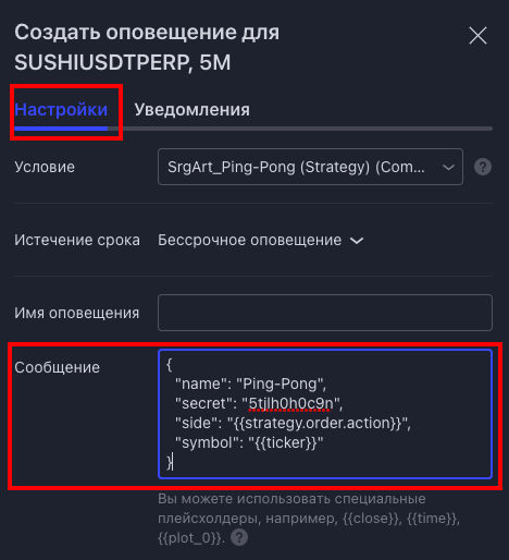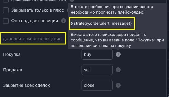 3) Создать алерт на стратегию и в поле "Сообщения" прописать следующий плейсхолдер: {{strategy.order.alert_message}}