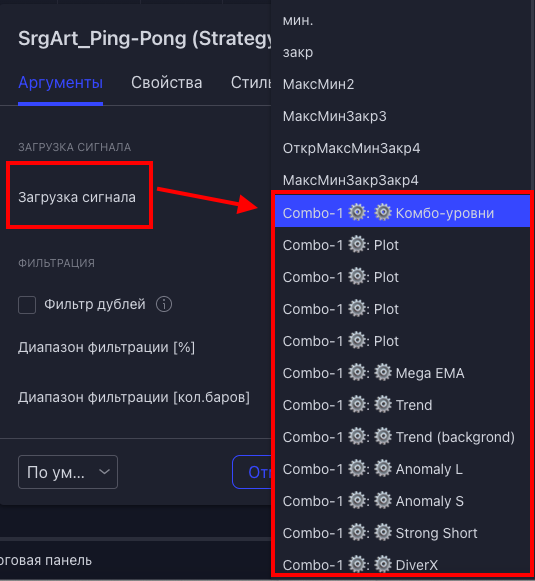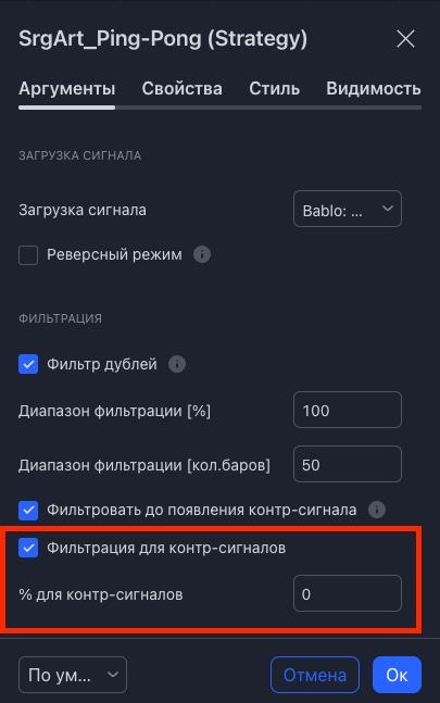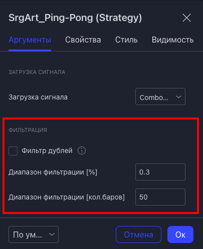 - в настройках, можно включить фильтрацию дублей и выставить параметры, на какой % и какое количество баров будет применена фильтрация (например, вы выставили 1% и 50 баров, это значит, что, если поступил сигнал в лонг и следующий сигнал в течение 50 баров тоже в лонг, но он по расстоянию от предыдущего не дальше 1%, то этот сигнал будет фильтроваться)