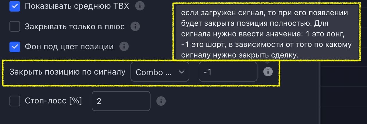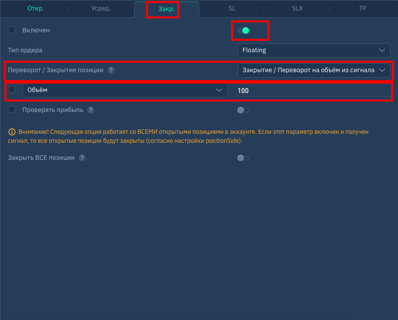 - активируем вкладку "закрыть" и указываем сумму закрытия (или количество монет) при поступлении противоположного сигнала