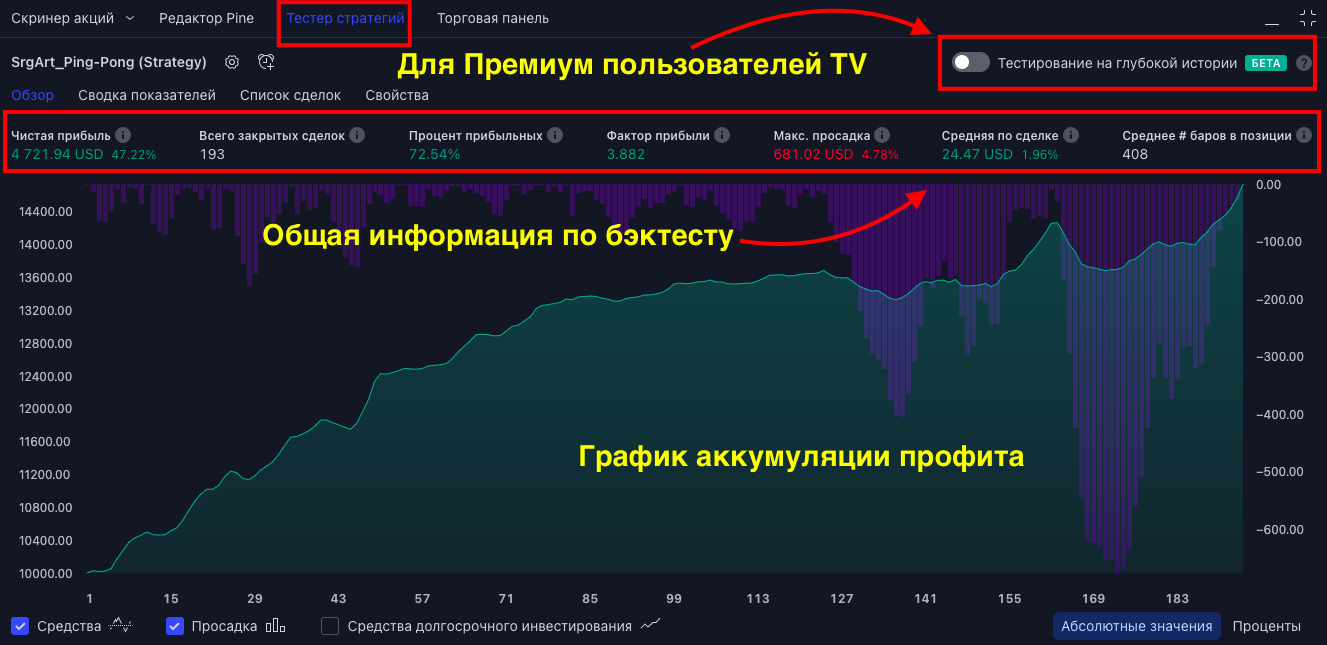 - после всех настроек и выбора сигнала, можно открыть "Тестер стратегий" и посмотреть, как отрабатывал сигнал на истории (для пользователей Trading View с подпиской "Премиум" есть возможность посмотреть отработку на "глубокой истории", то есть, например, работая на 5м ТФ можно посмотреть бэктест за год или два)
