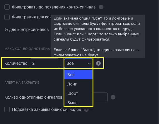 3) Добавлен выбор на максимальное количество однотипных сигналов: все, лонг, шорт, выкл.