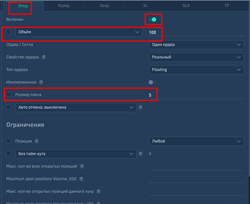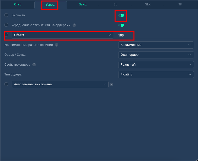 - активируем вкладку "усреднить" и указываем сумму усреднения (покупки) позиции при поступлении однотипного сигнала