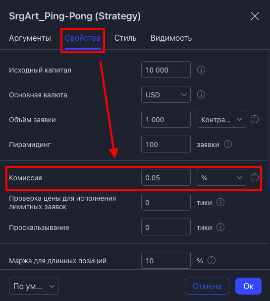 - так же, можно выбрать комиссию, которая будет использоваться при торговле (по умолчанию = 0.05%)