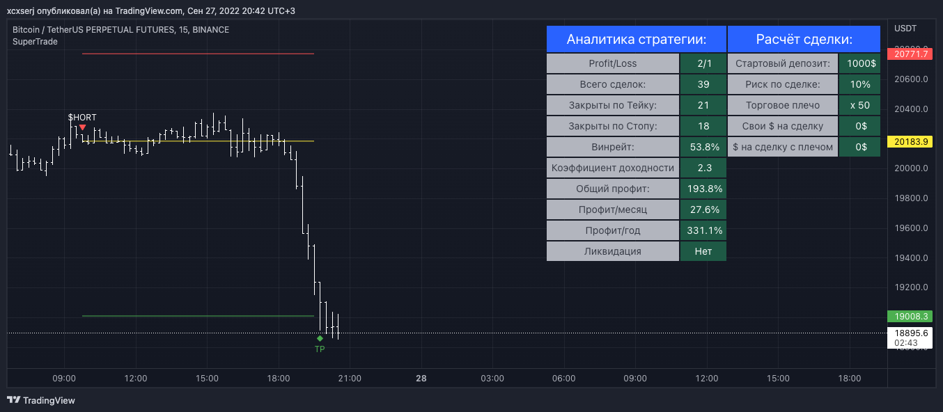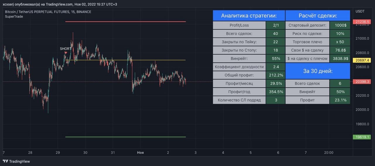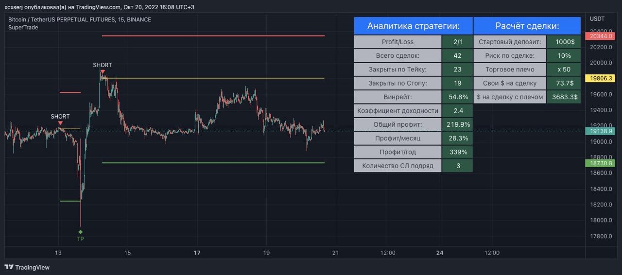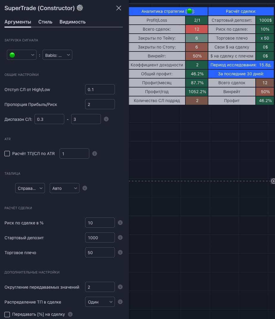 Обращаю внимание, что все стратегии разрабатывались на аккаунте Trading View с подпиской "Премиум" (доступ к 20000 барам), это означает то, что те, у кого нет премиум подписки, индикатор будет показывать результаты стратегии не верно: могут быть минусовые аналитические данные и прочие искаженные результаты. Верные данные будут поступать в телеграм-канал - оттуда можно черпать информацию о сделках (профит/месяц, винрейт). Без премиум подписки вы сможете видеть новые сделки и небольшую историю графика, так же расчитывать свой риск по сделке и сумму на сделку, исходя из вашего начального депозита. Но, более полные данные по стратегии поступают именно на премиум аккаунты, так как там большая видимая история графика и данных намного больше.
