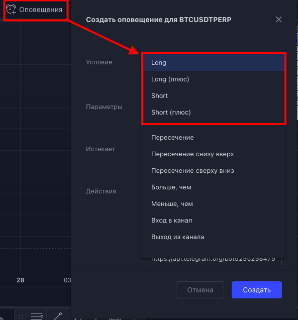 Обратите внимание, что если указана торговая пара с пометкой PERP, необходимо открывать график представленной торговой пары по поиску TradingView с биржи Binance: "BTCUSDTPERP"