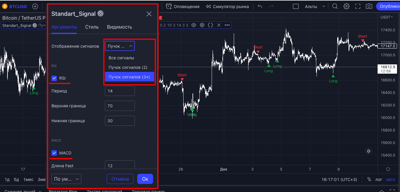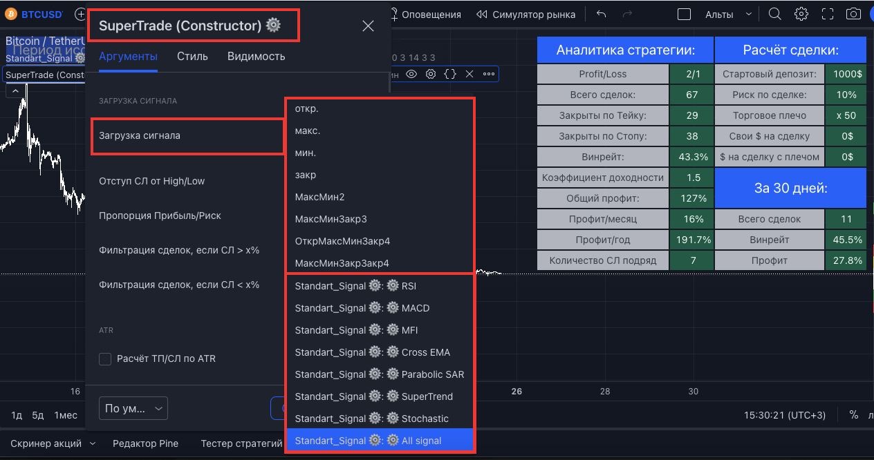 - перейти в SuperTrade (Constructor) и в выпадающем меню "загрузка сигнала" выбрать один из сигналов, помеченных шестеренкой ⚙️ (можно выбрать как отдельный сигнал, например RSI, так и тот, который вы настроили на графике, выбрав "All Signal")