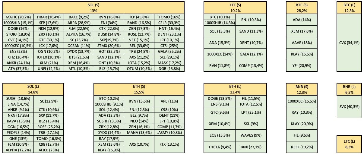 Например, есть у нас стратегия «BNB Short 30м». Применительно к BNB эта стратегия работает. Но есть еще 5 альткоинов, которые так же хорошо работают по данной стратегии, а некоторые даже с ещё большей доходностью. И так касаемо всех десяти стратегий.
