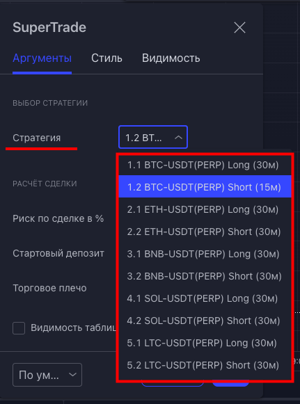В списке стратегий указана торговая пара (например, BTC-USDT), принадлежность к рынку (например, PERP - фьючерсный рынок), стратегия на повышение цены (Long) или на понижение (Short), а так же Тайм-фрейм, на котором необходимо запускать данную стратегию (например, 30м).