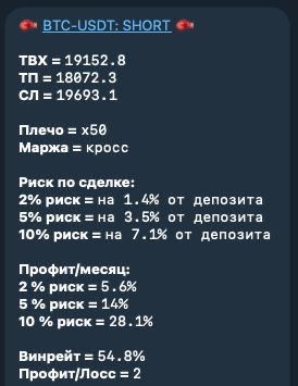 Чтобы это всё преподнести в удобном виде, дополнительно к индикатору был создан специальный телеграм-канал, куда бот присылает сообщения о каждой сделке, каждой стратегии с аналитикой и ценами, где располагается точка входа в сделку, где тейк-профит, а где-стоп лосс ставить. Так же, этот бот показывает на выбор, на какой процент от депозита надо заходить в сделку, на каком плече, в зависимости от выбранного вами риска (2-5-10%). Так же, в зависимости от риска, отображается статистический профит/месяц (среднее значение профита, исходя из аналитических данных).