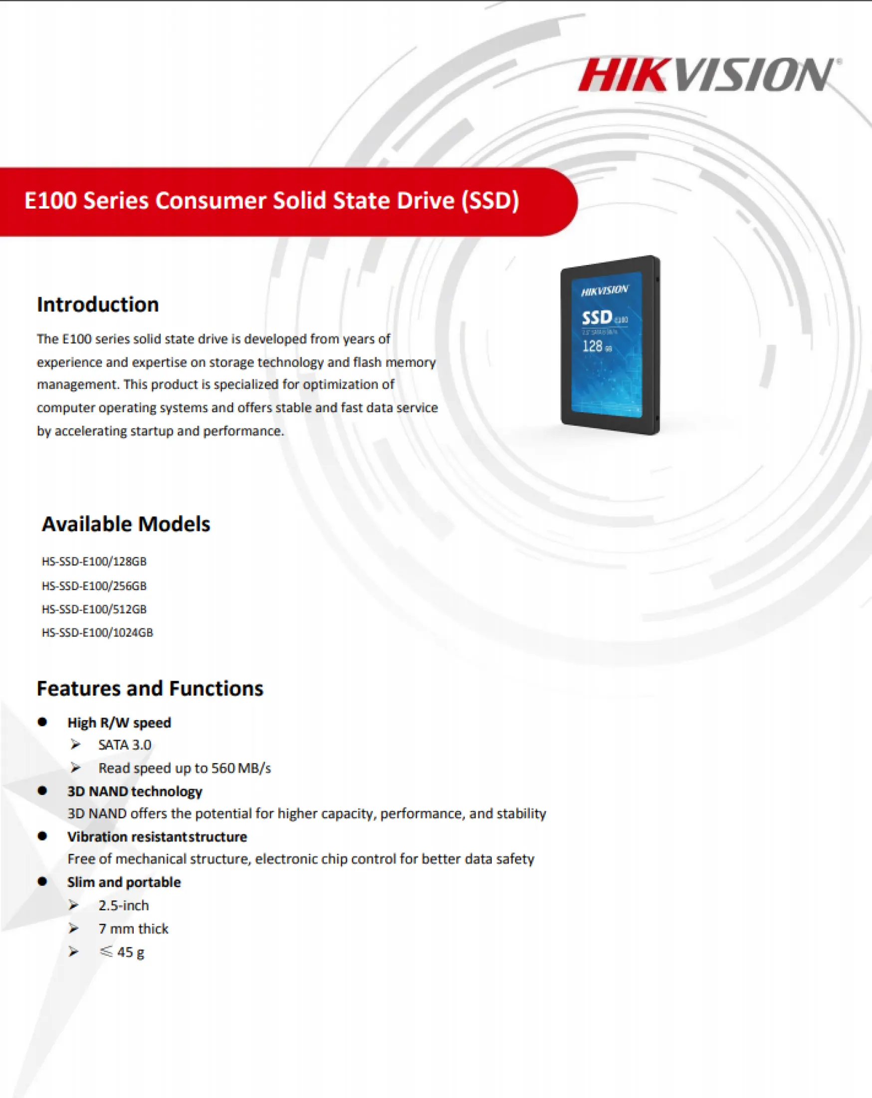 HS- SSD - E100 /128GB HS- SSD - E100 / 256GB HS- SSD - E100 /512GB HS- SSD - E100 /1024GB Features and Functions High R/W speed SATA 3 .0 sRead speed up to 560 MB/ 3D NAND technology 3D NAND offers the potential for higher capacity, performance, and stability Vibration resistantstructure