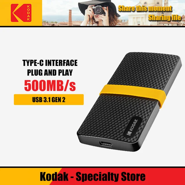 KODAK portable SSD X200 . High performance that fits in your pocket! Up to 420MB/s write speed . Up to 450MB/s read speed . Interface USB-C 3 .1 Gen 2 (10 Gbps) USB 3 .1 compatible (USB-C to USB-A cable included) Capacities: 128, 256, 512, 1TB . 3 years warranty .