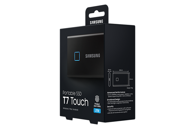 Купить портативный SSD Samsung T7 Touch 2 Тб черный с USB 3 .2, сканером отпечатков пальцев, весом всего 58 граммов, в прочном металлическом корпусе .
