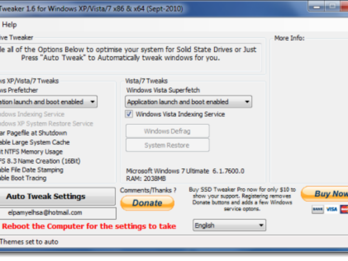 SSD Tweaker for Windows . Ottimizzare Windows XP, Vista e 7 per le unità SSD Con tutti i consigli online per i dischi rigidi SSD può richiedere ore di ricerca e giocherellando a configurare correttamente l'unità SSD . Ora, con questa piccola applicazione è possibile Tweak Windows 2K/XP/Vista e 7 compresi x64 in pochi secondi .